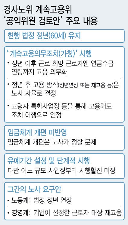공익위원들은 이르면 다음 달 초 계속고용의무조치를 골자로 한 공익위원 검토안을 내놓을 계획이다. 공익위원들이 검토안을 마련한 것은 계속고용위 운영 기한(오는 6월 말)이 다가오고 있어서다. 노사정은 한국노총이 대화 불참을 선언하기 직전인 지난해 11월 말까지 10차례 모여 회의를 했으나, 이견만 확인했을 뿐 별다른 진전이 없었다. 검토안을 토대로 노사가 논의를 이어가 오는 6월 말까지 합의를 이끌어내겠다는 게 공익위원들의 복안이다.