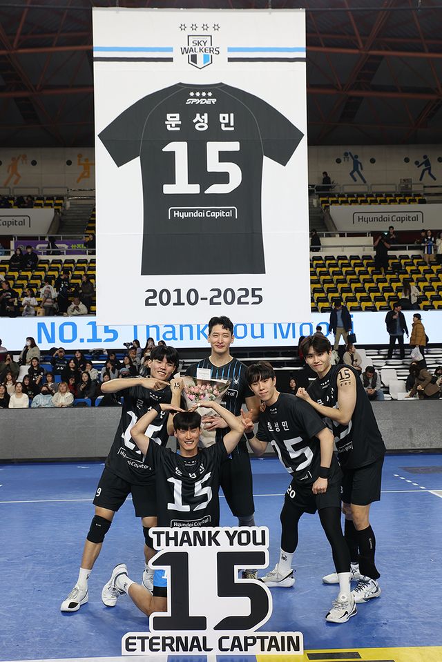 현대캐피탈은 20일 천안유관순체육관에서 열린 도드람 2024-2025 V-리그 남자부 6라운드 OK저축은행과의 경기가 끝난 뒤 문성민의 은퇴식을 진행했다. 행사는 감사 영상 'Thank you mooni'를 시작으로 핸드프린팅 기념식, 영구결번식, 은퇴사로 구성됐다.