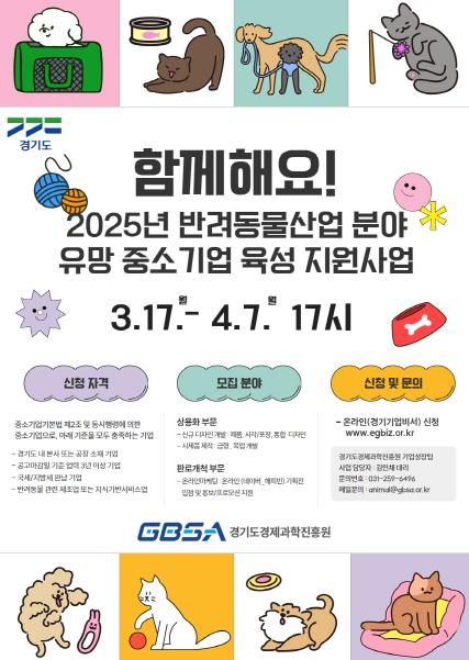 지원 대상은 경기도 소재 본사 또는 공장을 보유한 업력 3년 이상의 반려동물용품 관련 제조업 또는 지식기반서비스업을 영위하는 중소기업이다.