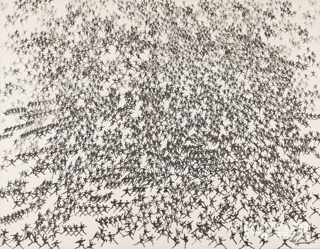 그 연작 중 한 점인 ‘군상’(1986)은 가로 270㎝, 세로 211㎝에 달하는 대작이다. 여든 둘의 노화가는 이 거대한 화면을 오직 먹만 사용해 사람의 형상으로 채웠다. 이만큼 큰 화폭을 가득 채우고 있는, 이렇게 많은 사람이라니. 도대체 몇 명이나 될지 어림조차 되지 않는다.