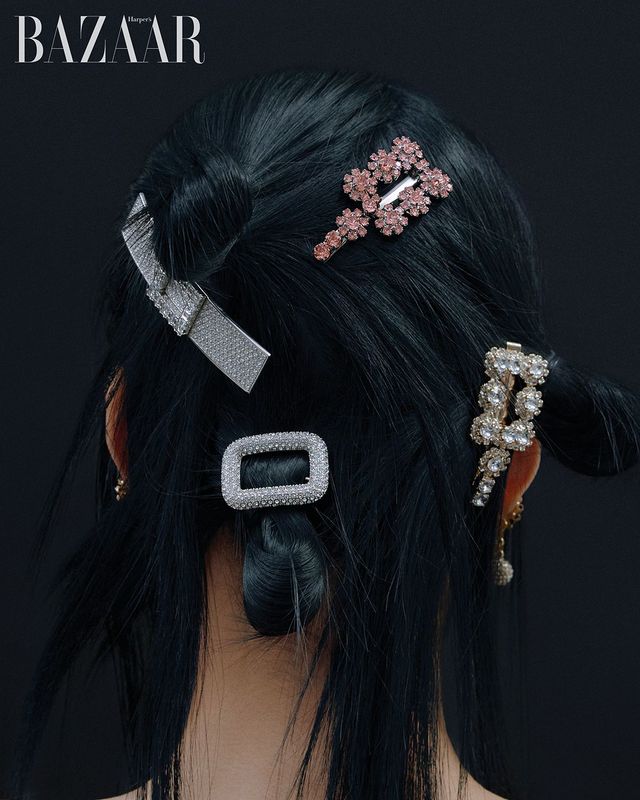 ‘에플로레센스’ 헤어 클립은 69만원, ‘트레 비비에 스트라스 미니’ 이어링은 69만원, ‘비브 쇼크 스트라스’ 헤어 클립은 69만원, ‘벨 비비에 트럼펫’ 펌프스는 1백15만원 모두 Roger Vivier. 미니 드레스, 스타킹은 스타일리스트 소장품.