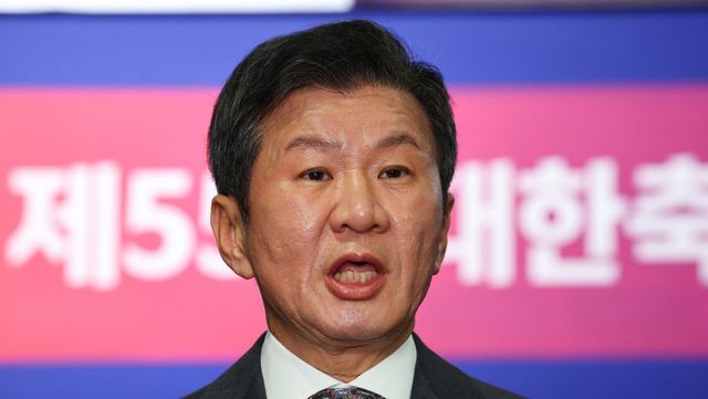 대한축구협회장 4연임에 성공한 정몽규 회장이 지난달 26일 서울 종로구 축구회관에서 열린 제55대 대한축구협회 회장 선거에서 당선이 확정된 뒤 소감을 밝히고 있다. / 연합뉴스