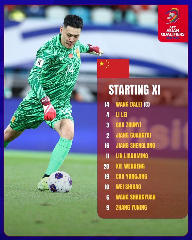 중국은 4-2-3-1 전형으로 나섰다. 왕다레이가 골문을 지켰고, 리레이, 장성룽, 장광타이, 고준익이 백4를 구성했다. 시에원넝, 왕상위안이 허리를 받쳤다. 림량명, 웨이시하오, 차오융징이 2선에 위치했다. 장위닝이 최전방 원톱으로 출전했다.