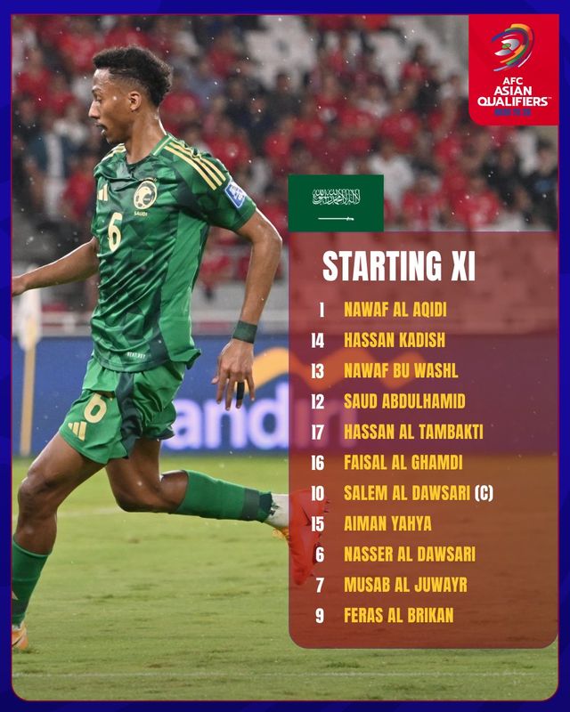 사우디는 4-4-2 전형을 꺼내들었다. 나와프 알아키디가 골키퍼 장갑을 꼈다. 사우드 압둘하미드, 하산, 알탐바크티, 하산 카데시, 나와프 부샬이 수비를 맡았다. 아이만 야히야, 파이셀 알감디, 나세르 알도사리, 살렘 알도사리가 중원에서 호흡을 맞췄다. 무사브 알주와이르, 피라스 알부라이칸이 투톱으로 짝을 이뤄 득점을 노렸다.
