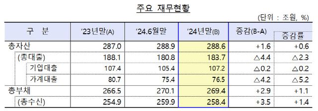 총대출은 183조 7000억원으로 2023년 말 대비 4조 4000억원(2.3%) 감소했다. 기업대출(107조 2000억원)은 2000억원(0.2%), 가계대출(76조 5천억 원)은 △4조 2000억원(5.2%) 각각 줄었다.