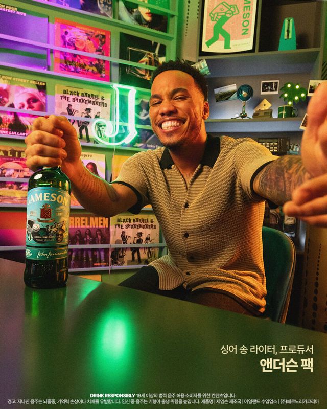 제임슨은 오랜 시간 동안 음악과 연계된 다양한 활동을 통해 음악 씬에서 독보적인 존재감을 발휘해 왔습니다. 이번 디스틸드 사운즈 에디션은 브랜드의 감성을 한 단계 더 끌어올리는 계기가 될 전망인데요. 이 캠페인은 전 세계 20명 이상의 아티스트들이 각자의 음악적 스타일과 영감을 나누고, 이를 융합해 새로운 사운드를 창조하는 과정을 담고 있습니다. 그 중심에는 제임슨의 글로벌 앰배서더이자, 네오 소울과 힙합을 넘나들며 자신만의 독창적인 음악 세계를 구축해 온 앤더슨 팩이 있죠.