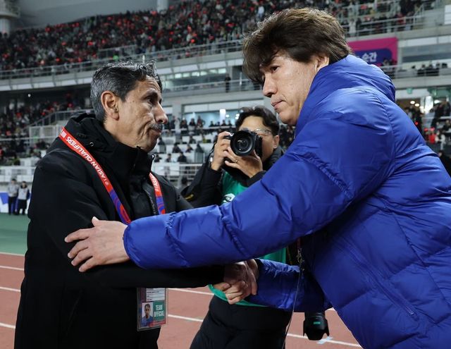 대한민국 홍명보 감독과 오만 라시드 자베르 감독이 20일 오후 경기 고양시 고양종합운동장에서 열린 2026 국제축구연맹(FIFA) 북중미 월드컵 아시아 3차 예선 B조 7차전 대한민국과 오만의 경기에 앞서 인사를 나누고 있다. / 뉴스1