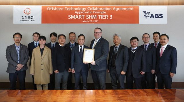 한화오션은 미국 선급 ABS로부터 '스마트 선체 구조 건전성 모니터링 티어 3(Smart Structural Health Monitoring Tier 3)'에 대한 개념 승인(AiP·Approval in Principle)을 획득했다.