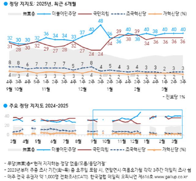 14일 한국갤럽이 지난 18~20일(3월3주) 전국 만 18세 이상 성인 1003명을 대상으로 조사한 결과, 민주당 정당 지지도는 3주 연속 동일한 40%로 집계됐다. 국민의힘은 4주 연속 36%다.
