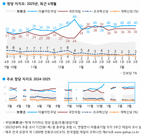 이번 조사는 한국갤럽이 자체 기획·실시했으며, 전국 만 18세 이상 유권자 1003명을 대상으로 3월 18일부터 20일까지 무선전화 RDD 방식으로 면접조사를 진행했다. 응답률은 13.4%, 표본오차는 95% 신뢰수준에서 ±3.1%포인트다.