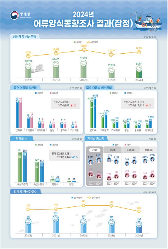 생산 금액은 대규모 폐사로 인해 산지 가격이 오르며 1년 전보다 8.0% 늘어난 1조 2112억원이었다. 넙치류의 경우 2023년 1㎏당 1만 6187원이었던 산지 가격이 1만 7052원으로 5.3% 오르고, 조피볼락97.3%), 참돔(5.1%) 등 주요 횟감들의 가격도 일제히 올랐다.