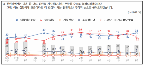 여론조사기관 엠브레인퍼블릭·케이스탯리서치·코리아리서치·한국리서치가 지난 17일~19일 전국 만 18세 이상 남녀 1003명을 대상으로 실시한 여론조사에서 정당 지지율은 더불어민주당 38%, 국민의힘 32%, 조국혁신당 7%, 개혁신당 1%로 나타났다. 국민의힘은 지난 조사에 비해 6%p 하락했고, 민주당은 2%p 상승했다.