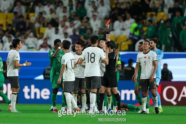 하지만 중국의 기대는 전반부터 무너졌다. 경기 초반 사우디의 우세가 이어지던 시점, 사우디 알 감디가 코너킥 공격 중 먼저 득점을 터뜨렸다. 일단 비디오판독(VAR)으로 득점이 취소돼 한숨을 돌렸다. 하지만 전반 추가시간 중 린 린앙밍이 공을 차 내려다 카디쉬의 머리를 발로 가격했다. 주심은 린앙밍에게 곧바로 레드카드를 꺼냈다.