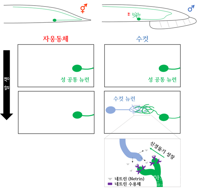 김병혁 교수 연구팀은 신경계의 전체 신경회로 지도가 완벽하게 알려진 예쁜꼬마선충 모델을 이용해 신경회로 성 차이의 형성 원리를 탐구했다고 밝혔다. 연구는 성 공통 뉴런을 대상으로 진행했으며, 이 뉴런은 수컷에서만 신경돌기를 생성해 새로운 신경 연결을 만들어내는 것으로 알려졌다. 연구팀은 ‘성 차이를 만들어내는 핵심적인 분자는 무엇인지, 이러한 분자는 어디에서 유래하여 기능하는 것인지’에 대해 연구했다.