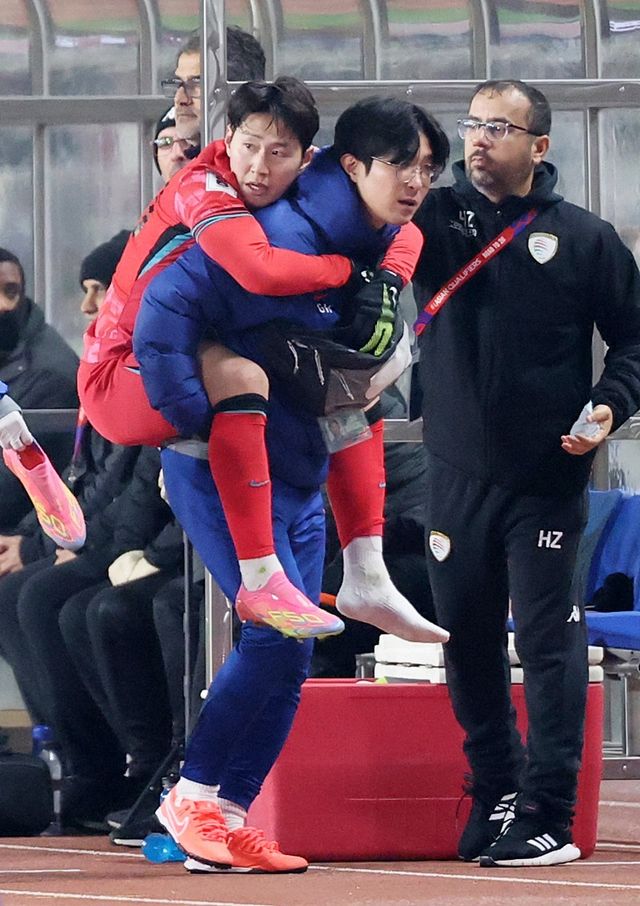 지난 20일 고양종합운동장에서 열린 2026 국제축구연맹(FIFA) 북중미 월드컵 아시아 지역 3차 예선 B조 7차전 한국과 오만의 경기에서 부상당한 이강인이 업힌 채로 경기장을 나서고 있다. / 뉴스1