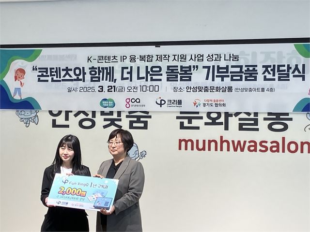 (뉴스영 이현정 기자) 경기도의 ‘K-콘텐츠 IP(지식재산권) 융복합 제작 지원’ 사업으로 성장한 콘텐츠 업체인 ‘㈜크리플(대표 임은채)’이 2억 4천만 원 상당의 콘텐츠 구독권을 다함께돌봄센터 경기도협의체에 기부했다.