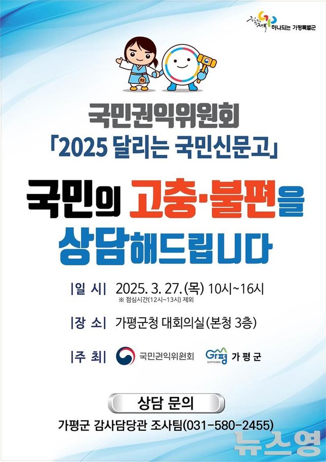 (뉴스영 이현정 기자) 가평군은 오는 27일 국민권익위원회와 함께 가평군청에서 ‘달리는 국민신문고’를 운영한다고 21일 밝혔다.