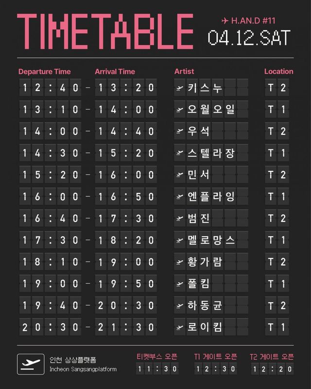 이번 핸드는 4월 12~13일 양일간 야외무대 ‘Terminal 1’과 실내 무대 ‘Terminal 2’ 두 개의 스테이지로 나뉘어 진행되는 가운데 총 24팀의 아티스트가 참여한다. ‘로이킴’, ‘10CM(십센치)’, ‘홍이삭’ 등 감성적인 싱어송라이터부터 ‘N.Flying(엔플라잉)’, ‘소란’, ‘오월오일’ 등 에너제틱한 밴드까지 합류했다.