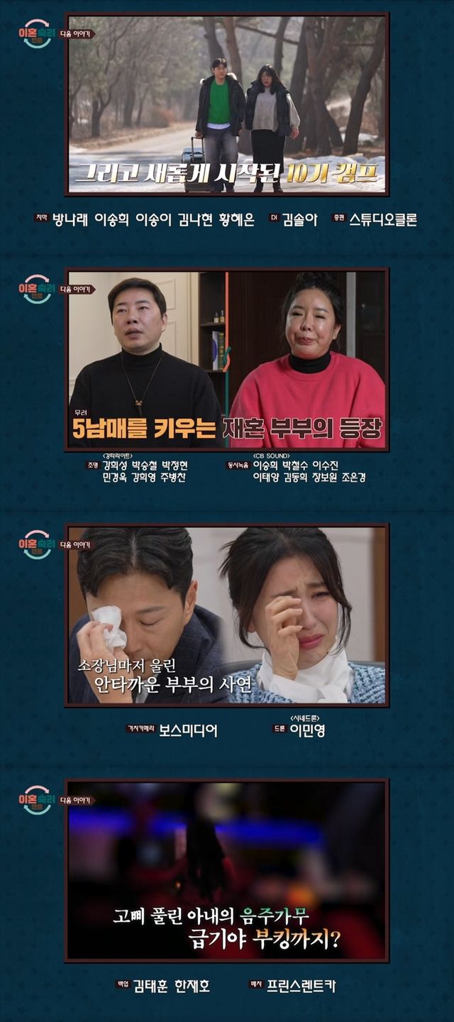 (엑스포츠뉴스 김보민 기자) 10기 부부로 5남매를 두고 음주가무에 이어 부킹을 하는 아내를 둔 '재혼부부'와 상습적으로 바람을 피우는 남편을 둔 부부가 등장했다.