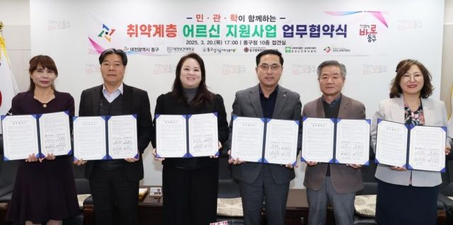 교육부 글로컬대학30 공모사업으로 추진된 이날 협약식에는 박희조 구청장을 비롯해 이정화 대전보건대 총장, 윤경환 동구정다운어르신복지관 관장, 김명희 동구행복한어르신복지관 관장, 임인식 금성노인복지센터 센터장, 김미애 선우노인복지센터 센터장이 참석해, 취약계층 어르신 지원 강화와 민·관·학 협력 돌봄 체계 구축에 손을 맞댔다.