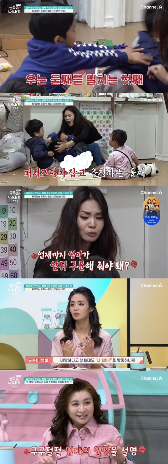 영상에서 둘째가 엄마와 부딪혀 넘어졌고, 울기 시작했다. 엄마의 사과에도 악을 쓰며 우는 둘째에게 첫째는 "소리를 질러보라"며 소리치기 시작했다. 엄마는 첫째를 혼내기 시작했고, 첫째는 둘째를 밀쳤다. 그러자 둘째는 첫째의 머리채를 잡아 스튜디오를 경악케했다.