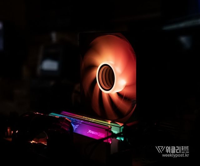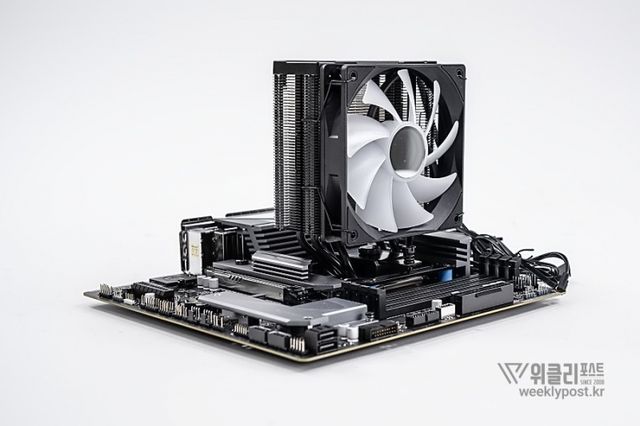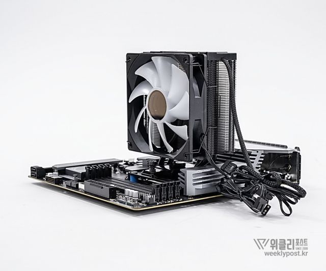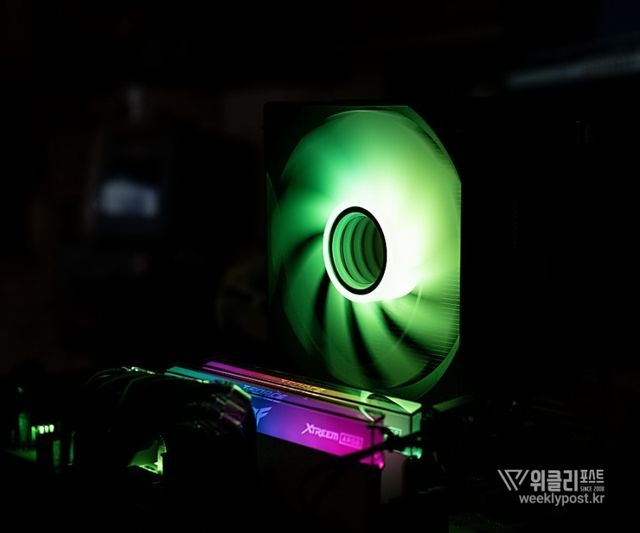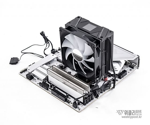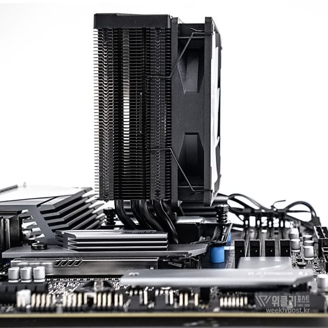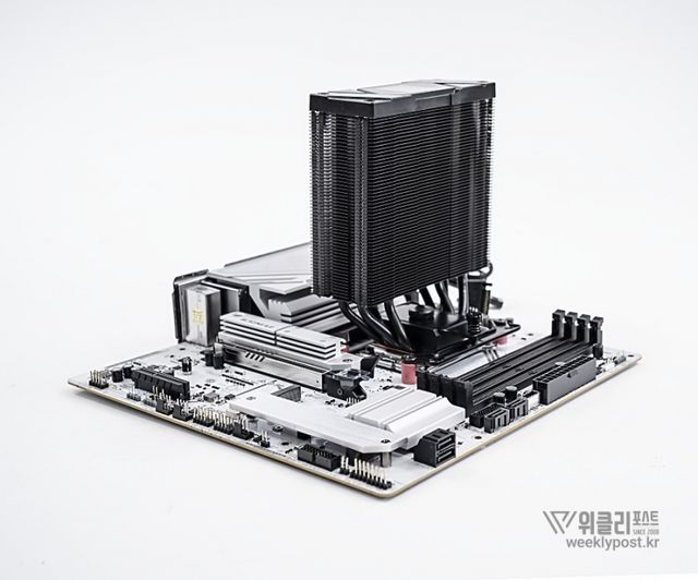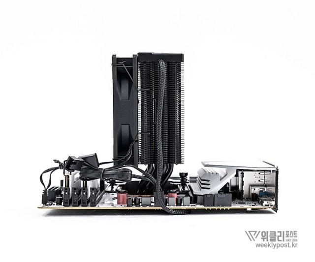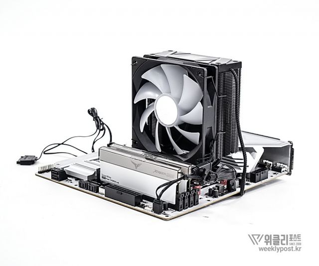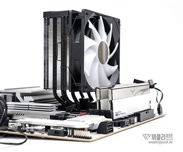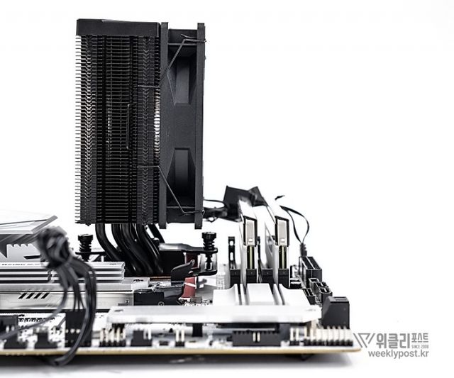 왜냐? 너무 평범하게 생겨서. 못생겼다고는 할 수 없지만, 그렇다고는 해서 또 매력 만점의 멋진 디자인을 갖춘 것은 아닌 것이다. 화려함 담당은 바로 옆에 RGB로 빛나는 메모리가 담당하는 경우가 많다. 사실은 이것도 싱글타워 공랭쿨러의 장점이다. 고성능 메모리를 사용해도 간섭이 없기 때문이다.