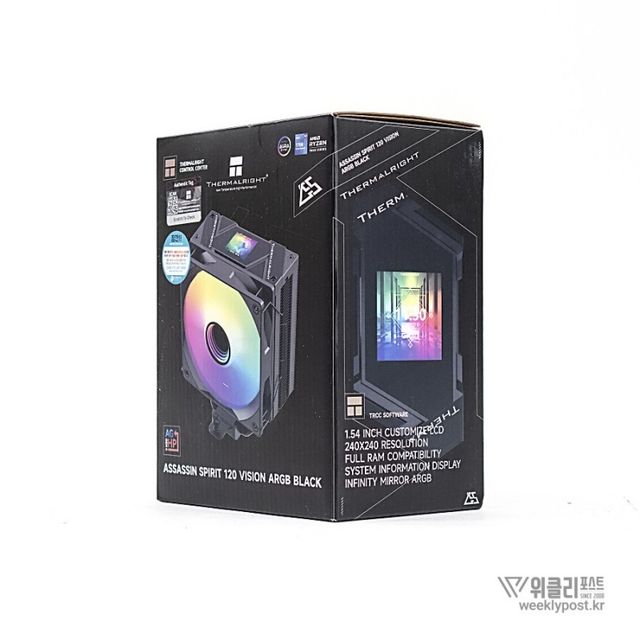 혹시 공랭 지지자인데 화려하지 않아 울며 겨자먹기로 수랭을 골랐던 유저가 있는가? 그렇다면 서멀라이트 어쌔신 스피릿 120 비전 블랙 ARGB가 해답이 될 수 있다. LCD 디스플레이가 장착된 ‘화려한 싱글타워 공랭 쿨러’라는 새로운 패러다임을 제시한 제품이라 볼 수 있기 때문이다.
