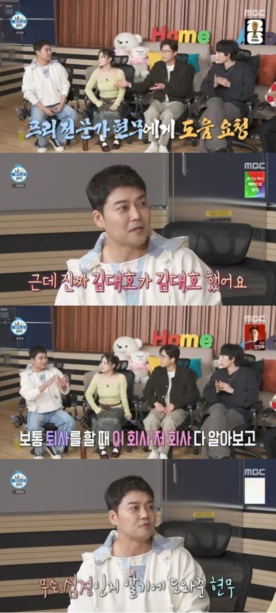전현무는 "김대호가 김대호 했다. 저 퇴사 할 때 이 회사, 저 회사 알아보고 나왔다. 얘는 나오고 나서 '어떻게 해야 하느냐'고 하더라. 대책 없이 나와서 내가 마음이 급해서 여기저기 만나게 해준 거다"라고 전했다.