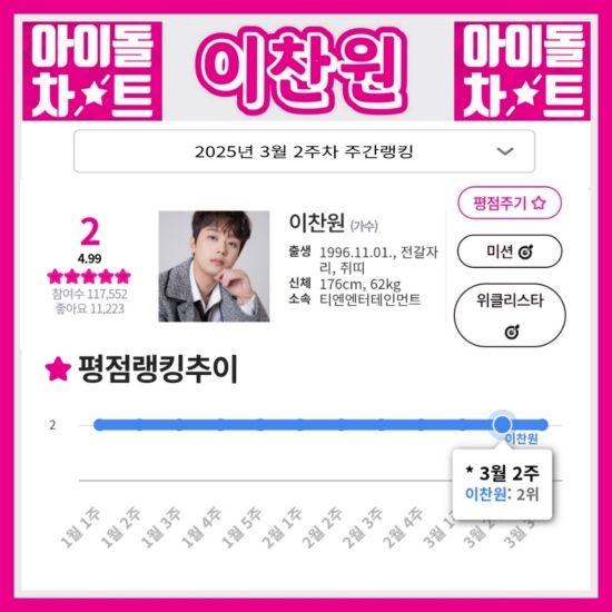 아이돌차트는 최근 이찬원이 2025년 3월 2주 차 평점 랭킹에서 117,552표를 받아 2위를 차지했다고 밝혔다.