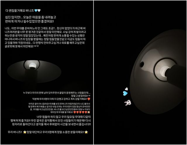 그는 이어 "강하게 버티려고 하는 만큼 생각이 정말 많았는데 예전처럼 편하게 소통할 수 있는 상황은 아니어서 버니즈의 입장을 봤을 때 정말 힘들 것 같고, 지금도 힘들 것 같아 걱정이네요. 다 한 명씩 안아주고 위로를 해주고 싶은데 글로밖에 못해서 미안해요"라고 사과했다.