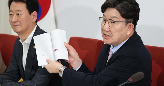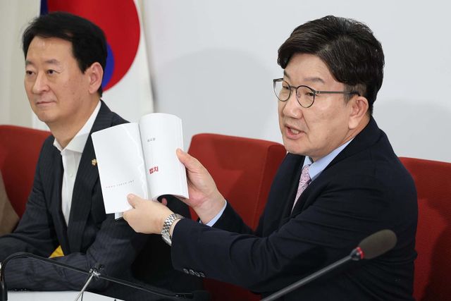 권성동 국민의힘 원내대표가 21일 오후 서울 여의도 국회에서 가진 기자간담회에서 최상목 대통령 권한대행 부총리 겸 기획재정부장관 탄핵소추안 발의와 관련해 더불어민주당을 비판하며 이재명 대표 망언집을 들어보이고 있다. / 뉴스1