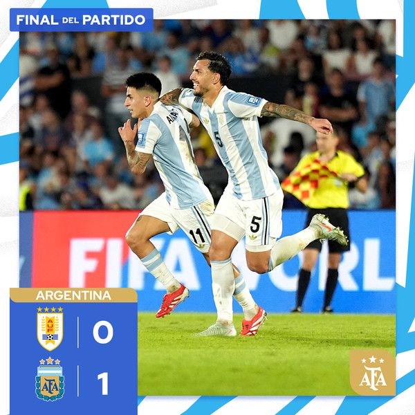 22일(한국시간) 우루과이 몬테비데오의 에스타디오 센테나리오에서 2026 FIFA 북중미 월드컵 남미 예선 13차전을 치른 아르헨티나가 우루과이에 1-0으로 이겼다. 아르헨티나는 승점 28점으로 선두 지위를 굳건히 했다.