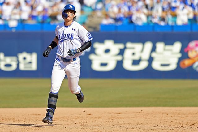삼성라이온즈 구자욱이 22일 대구삼성라이온즈파크에서 열린 2025 신한 SOL 뱅크 KBO리그 개막전 키움히어로즈와의 맞대결에서 5회말 투런포를 터트린 후 그라운드를 돌고 있다. / 삼성라이온즈 제공