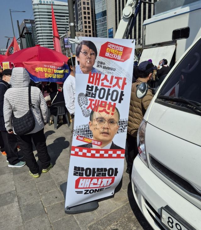 한동훈 전 국민의힘 대표를 성토하는 이들도 보였다. 검은 색 제복을 입은 한 사람은 지나는 이들에게 "배신자의 특징은 탈모가 오는 것"이라고 말했다. 국민의힘 안철수 의원과 한 전 대표의 사진을 붙이고 "배신자 밟아야 제맛"이라고 적힌 입간판을 세워둔 이들도 있었다.