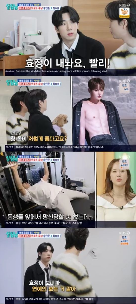 최수호와 송민준은 거실에 걸려 있는 박서진의 복근 사진을 보더니 "형 몸이 저렇게 좋다고요?"라고 의심의 눈초리를 보냈다.