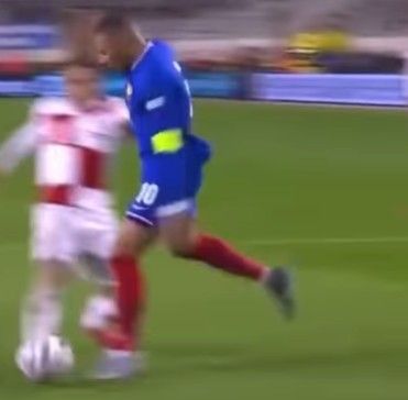 프랑스가 0-2로 뒤지고 있던 후반전, 음바페는 좌측면에서 동료와 2대1 패스를 주고받고 상대 페널티 받스 안으로 돌파했다. 이 과정에서 모드리치가 과감하게 발을 밀어 넣어 수비에 성공했다.