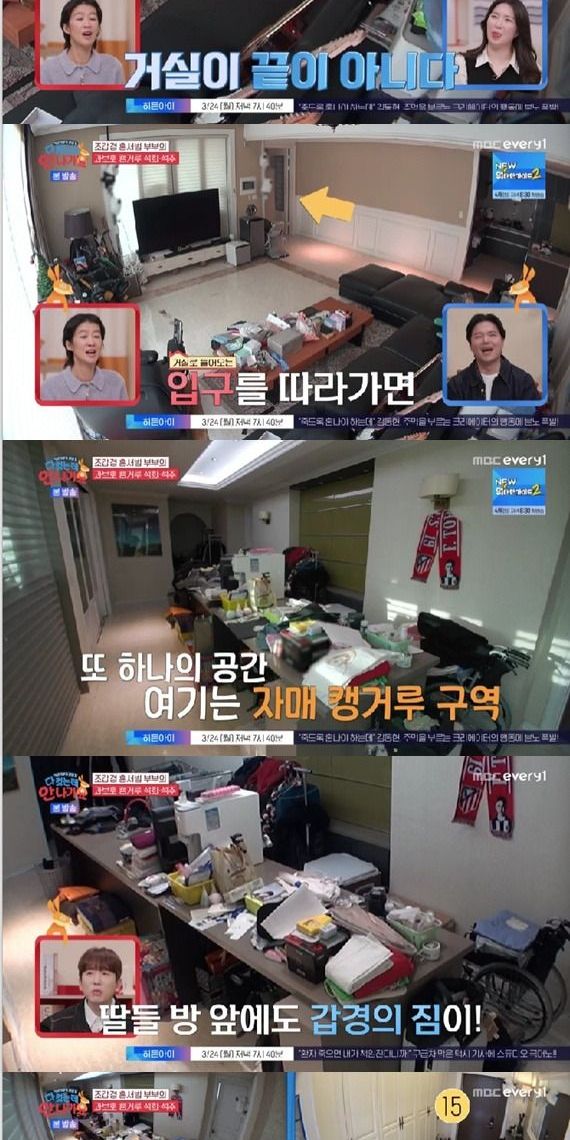 소파 뒤에는 짐들이 잔뜩 쌓여 있었다. 스튜디오에서 보던 홍진경은 놀란 표정을 숨기지 못했다. 딸들 방 앞에도 조갑경의 짐들이 가득했다.