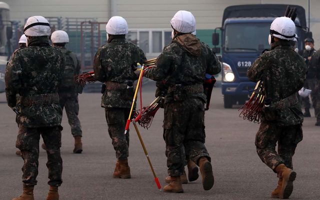 경남 산청 대형 산불이 사흘째로 접어든 23일 오전 산청군 시천면에서 39사단 장병들이 산불 진화작업을 준비하고 있다. / 뉴스1