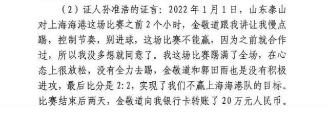 또한 “하프타임 진징다오와 손준호는 한국어로 일부러 시간을 끌자고 얘기를 나눴다. 실제로 손준호가 경기를 조절하면서 경기는 그대로 2-0으로 끝났다”며 “경기 후 진징다오는 돈을 한국에 있는 여동생에게 전해줬고 여동생이 그 돈을 다시 손준호의 에이전트에 전했다. 손준호는 2022년 1월 한국에 돌아와 에이전트로부터 진징다오가 주기로 한 40만 위안(8000만원)을 받았다”고 적혀있다.