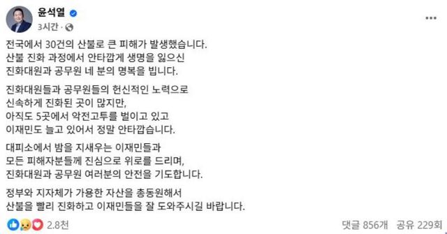 윤 대통령은 “진화대원들과 공무원들의 헌신적인 노력 덕분에 신속하게 진화된 곳이 많다”면서도 “아직도 5곳에서 진화 작업이 계속되고 있으며, 이재민도 증가하고 있어 안타깝다”고 현재 상황을 언급했다. 이어 “이재민들과 피해를 입은 모든 분들께 진심으로 위로를 전하며, 진화대원들과 공무원들의 안전을 기도한다”고 덧붙였다.