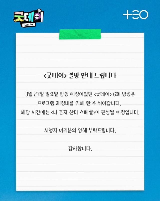 23일 '굿데이' 제작사 공식 인스타그램에 결방 안내 공지가 게재됐다. 제작사 측은 "3월 23일 일요일 방송 예정이었던 '굿데이' 6회 방송은 프로그램 재정비를 위해 한 주 쉬어갑니다"라며 "해당 시간에는 '나혼자산다 스페셜'이 편성될 예정입니다. 시청자 여러분의 양해 부탁드립니다"라고 전했다.