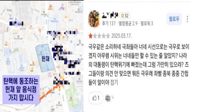 지난 17일부터 명단이 공유되면서 일부 식당에는 이유 없이 별점 1점 테러가 이어지고 있다. 한 ‘좌파 식당’으로 지목된 가게에는 “극우 같은 소리하네, 극좌들아” 같은 정치적 비방이 담긴 리뷰가 달렸다. 반면 이에 맞서 별점 5점을 남긴 이용자들은 “극우들이 몰려와서 별점 테러를 하고 있다”며 대응했다.
