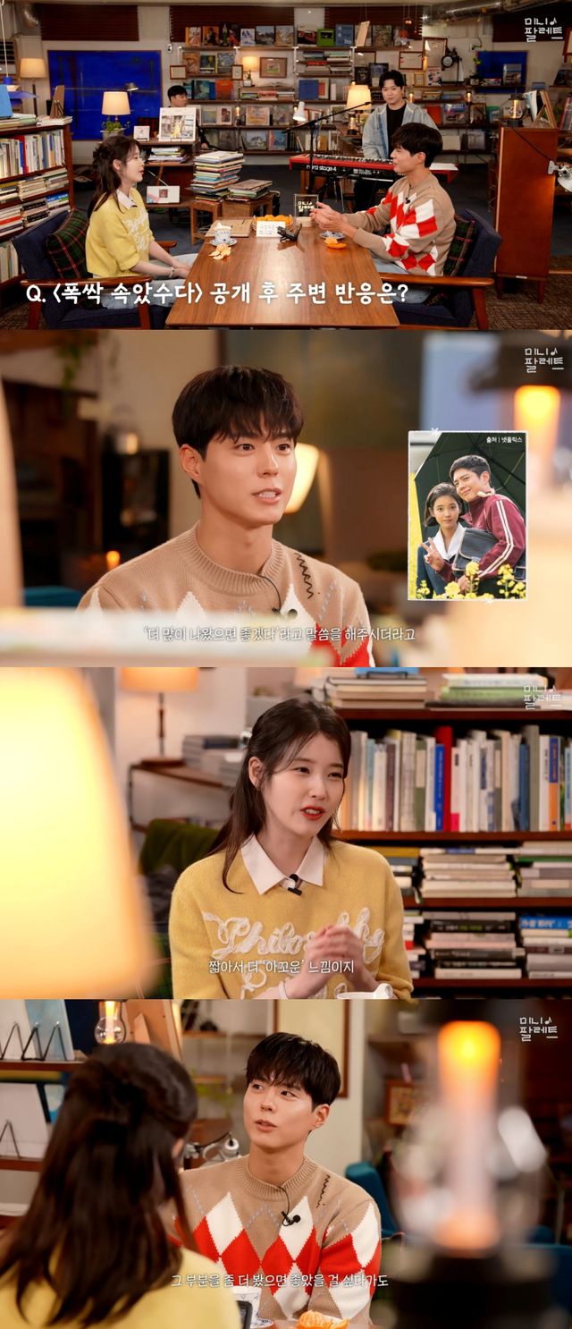 이날 두 사람은 빼놓을 수 없는 '폭싹 속았수다'에 대해 이야기했다. 먼저 아이유는 박보검에게 공개 후 주변 반응을 궁금해했고, 박보검은 "많이 축하를 해주시면서 나의 까까머리 시절과 애순의 똑단발 시절의 이야기가 더 많이 나왔으면 좋겠다고 말씀을 해주시더라"고 답했다.