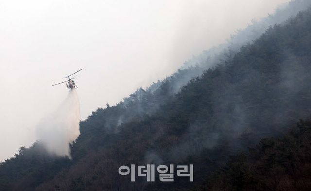 | [이데일리 노진환 기자] 경남 산청군에서 산불이 발생한 지 사흘째인 23일 오후 경남 산청군 시천면 일대에서 산림청 공중진화대원들이 산불을 진화하고 있다. |
