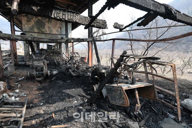 | [이데일리 노진환 기자] 경남 산청군에서 산불이 발생한 지 사흘째인 23일 오후 경남 산청군 시천면 중태마을에 불길이 덮쳐 창고가 전소됐다. |