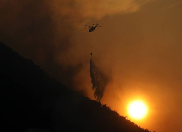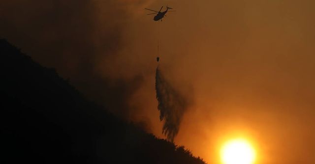 경남 산청 대형 산불이 사흘째로 접어든 23일 오후 산청군 단성면 일대에서 산불진화 헬기가 진화작업을 벌이고 있다 / 뉴스1