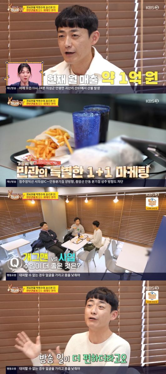 박명수가 "개그맨 활동과 사업 중 어느 쪽 수입이 더 낫냐"고 묻자 한민관은 "솔직히 돈 벌기 쉬운 건 방송 일이다. 밖에 나와서 사업하는 것은 훨씬 더 힘들다"고 솔직한 심정을 드러냈다.