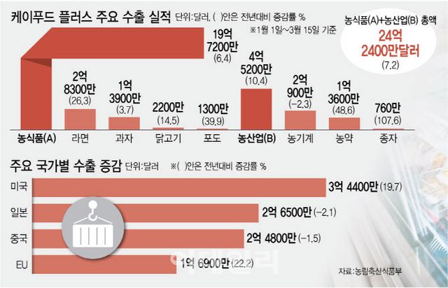 23일 농림축산식품부에 따르면 지난 15일 기준 농식품과 농업 전후방사업을 포함한 ‘케이푸드 플러스(K-Food+)’ 수출액은 1월부터 누적 24억 2400만달러(약 3조5500억원)를 기록해 1년 전보다 7.2% 증가했다. 농식품 수출액은 19억 7200만 달러로 6.4%, 농산업 부분은 4억 5200만 달러로 10.4%가 늘었다.