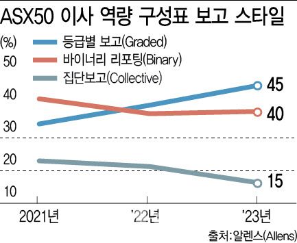 글로벌 로펌 알렌스(Allens)가 호주증권거래소(ASX) 상장 상위 50개 기업에 대해 분석 조사한 보고서에 따르면 2023년 기준 각 이사들의 역량을 등급별로 평가해 공개한 기업들이 45%에 달했고, 외부 전문가를 통해 객관적 평가를 받는 기업들도 늘어났다. 이는 형식적 보고 방식을 넘어 실질적 평가를 강화하고 투명성을 강화하려는 노력이다.