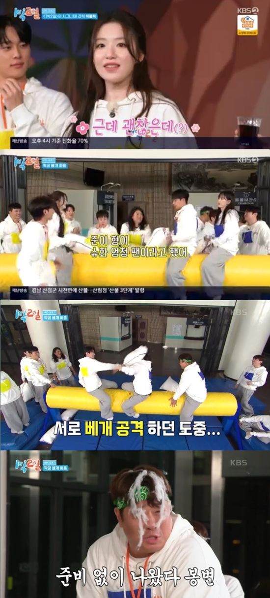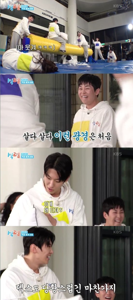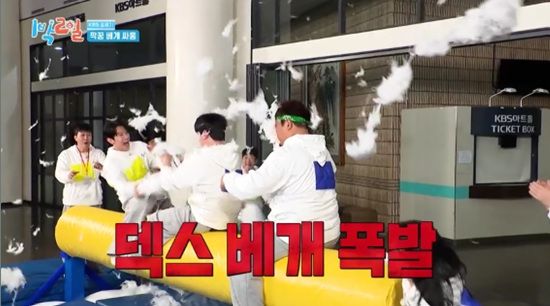 23일 방송된 KBS 2TV '1박 2일 시즌4'에서는 덱스가 베개싸움을 하던 중 베개가 터져 당황하는 모습이 전파를 탔다.